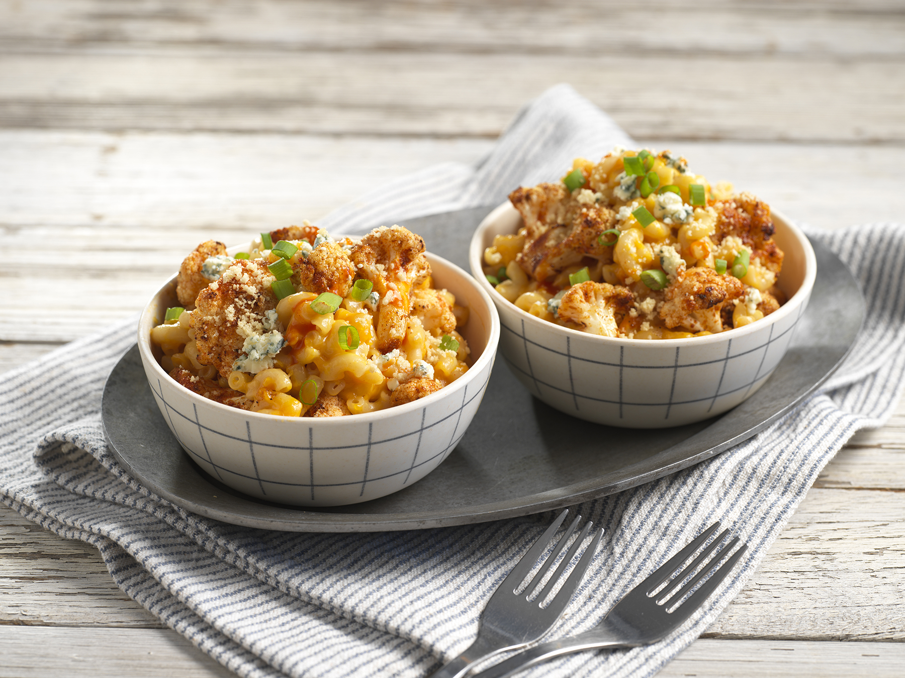 - Portion the mac and cheese into four bowls and garnish as desired with green onions, cheese, and a drizzle of buffalo sauce.