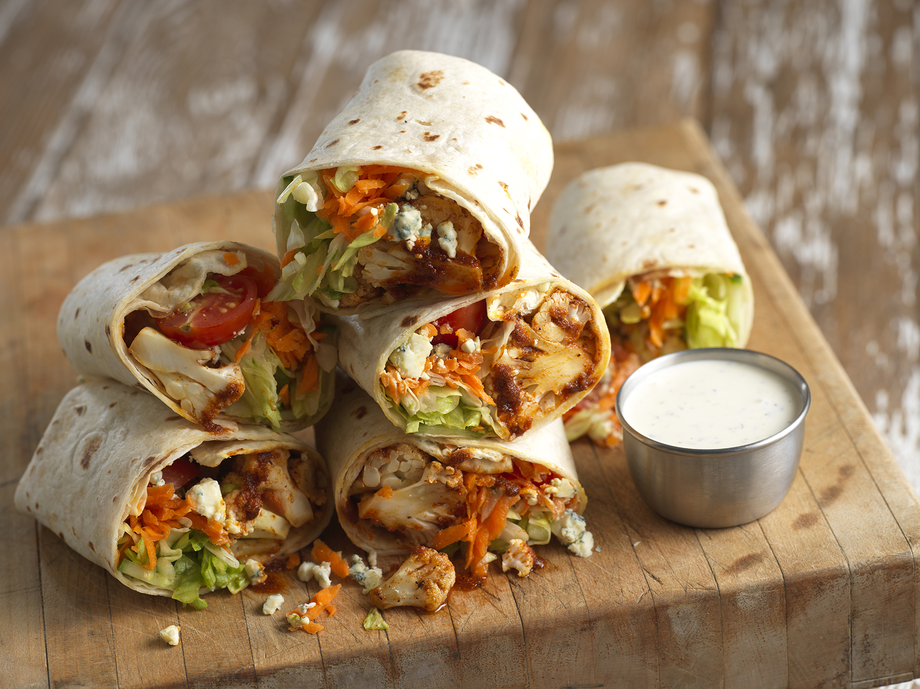 - Lay each tortilla flat and layer with shredded lettuce, Roastables Spicy Buffalo Cauliflower, shredded cheese, cucumbers, tomatoes, and shredded carrots.