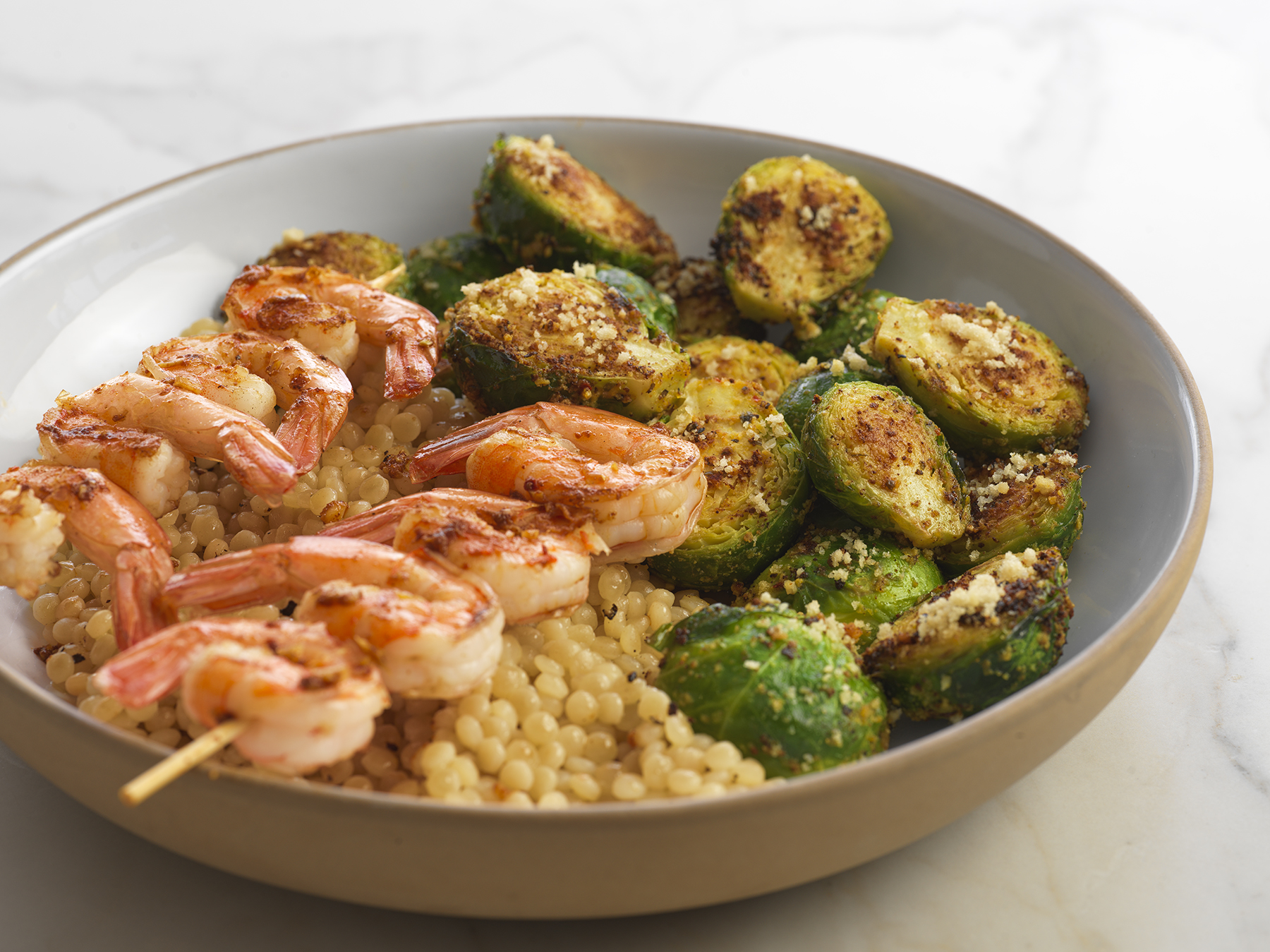 Lemon Caesar Brussels Sprouts with Grilled Shrimp Skewers and Israeli Couscous