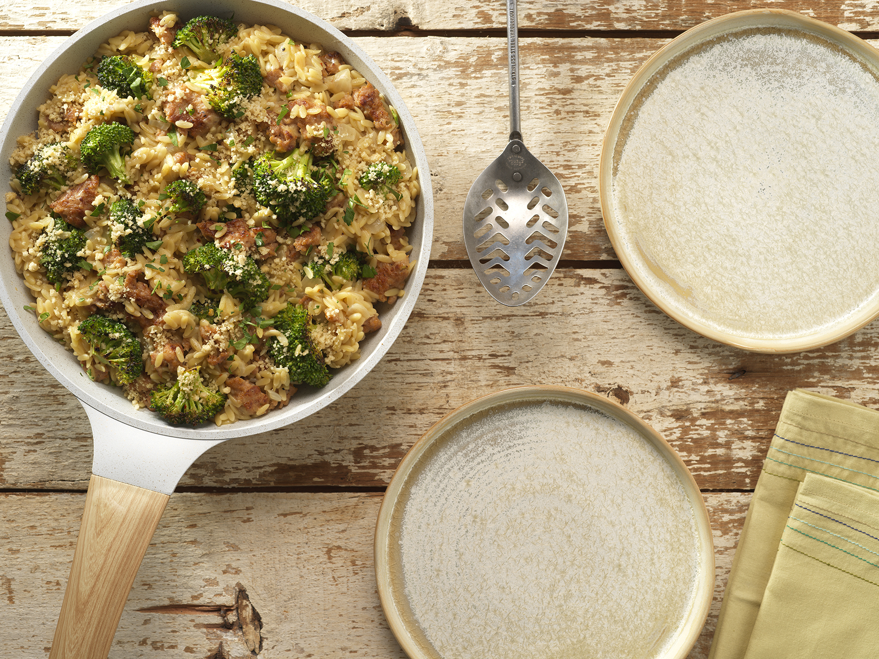 - Stir in the cooked sausage, Parmesan cheese, and cooked Roastables Zesty Herb Broccoli. Stir to combine and melt the cheese into the mixture.