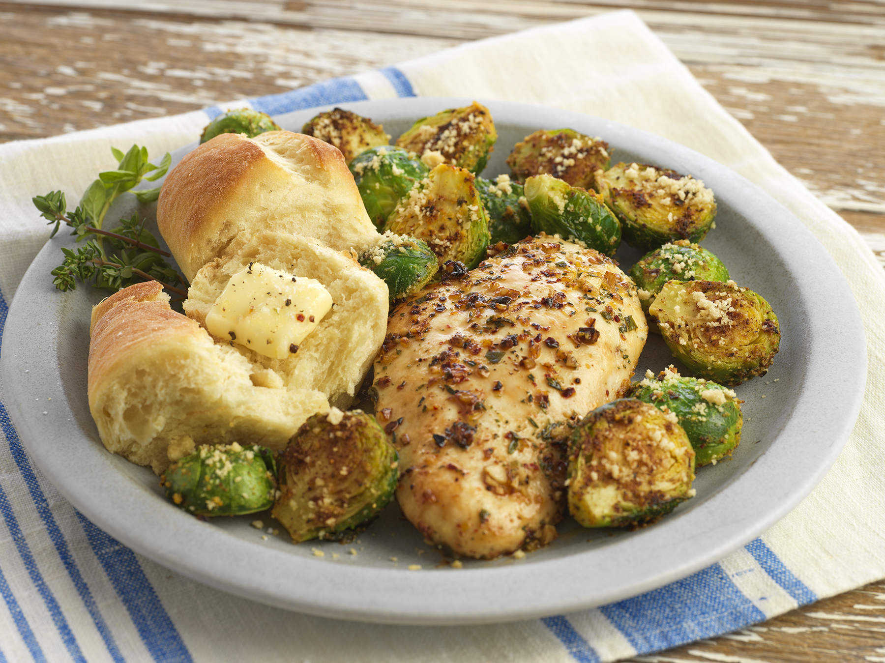 - Add chicken to the sheet tray with the brussels and roast for 15-18 minutes or until the chicken reaches an internal temperature of 165ºF.