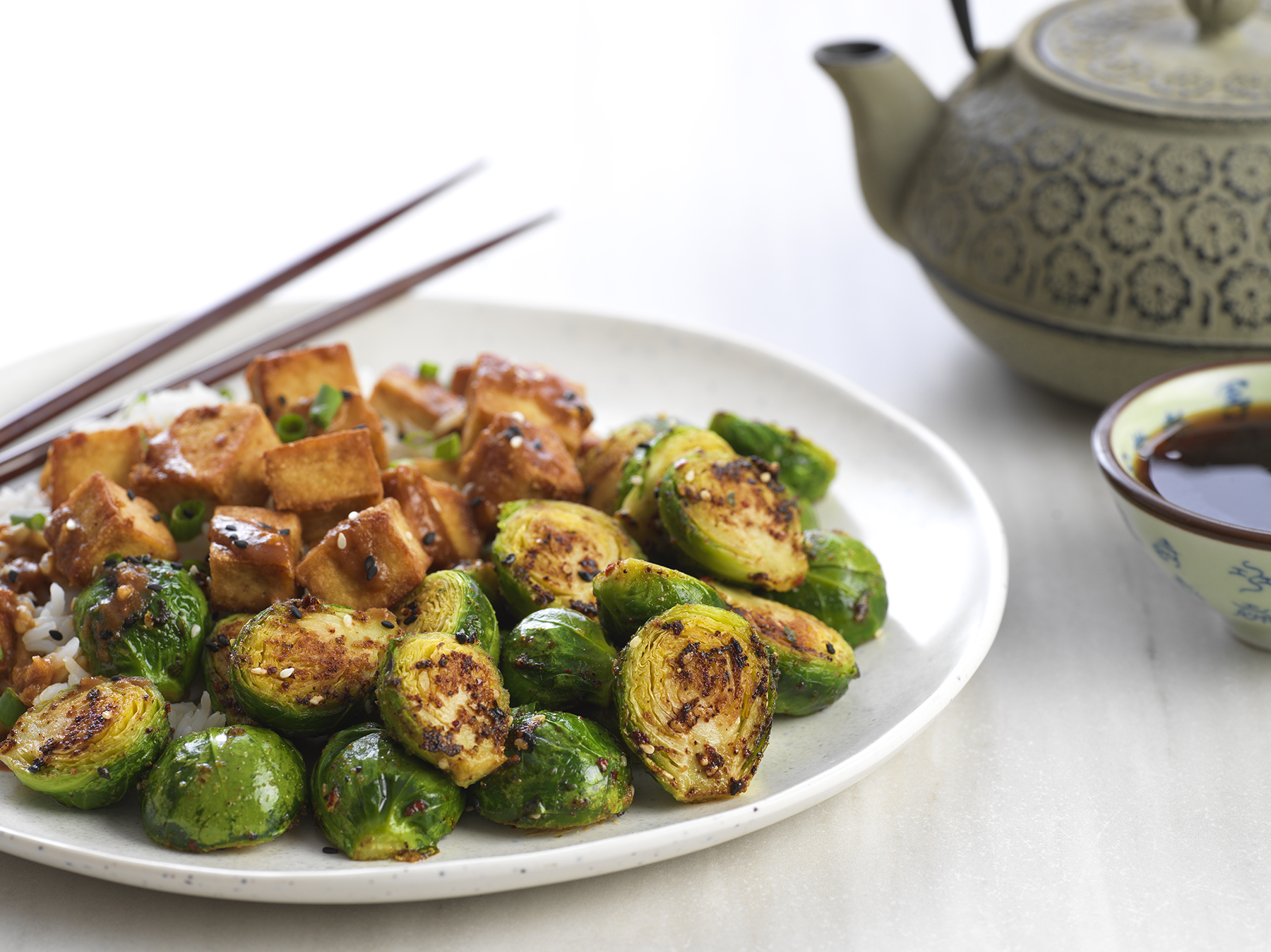- Toss tofu cubes into corn starch, soy sauce, and sesame oil. Place tofu cubes on the same baking sheet with Brussels sprouts.